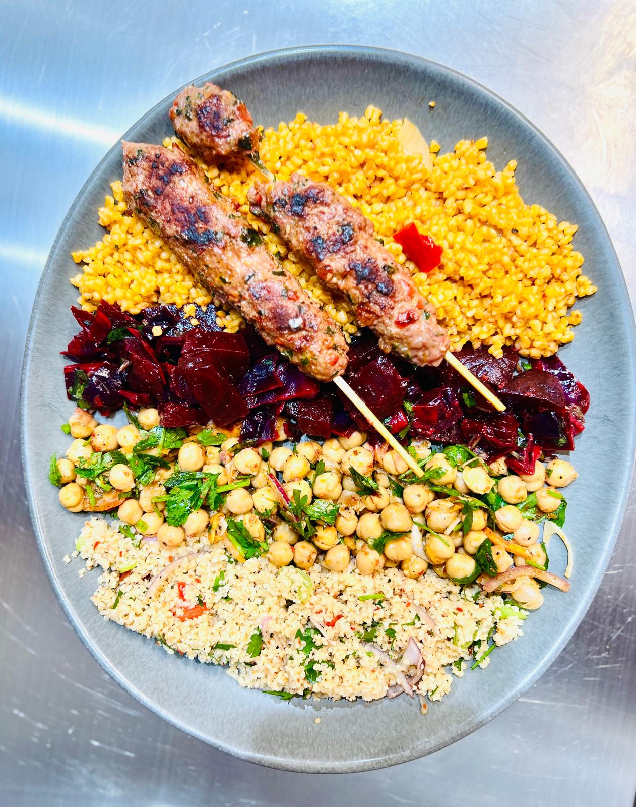 Indulge in our Free Range Grilled Lamb kofte house Special – a protein powerhouse with over 75g of protein. Savor the succulent flavours of our high-quality lamb Kofte, expertly grilled to perfection. Complete with your choice of three salads and a side of triple-cooked chips, sweet potato chips or warm Bulgar wheat.